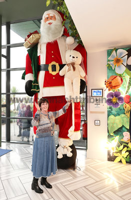 Reference: 352817 Mervue Renmore community Christmas Lunch 12.JPG | Photographer: Joe O'Shaughnessy |  | Caption: Áine Garvey beside a giant size Santa Claus at the entrance to the Connacht Hotel during the Mervue and Renmore Community Christmas lunch in the Connacht Hotel.