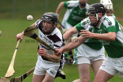 Sarsfields, Joseph Burke, and Turloughmore's, Brian Murphy, during the Senior Hurling Championship at Athenry.